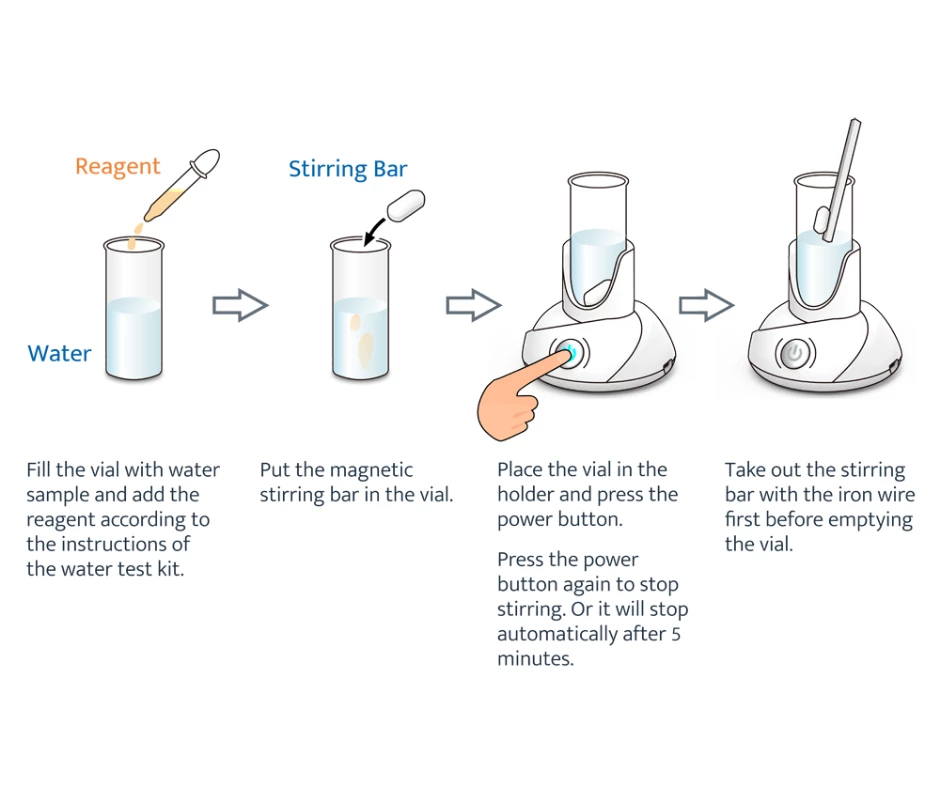 Just drop the magnetic stirring bar in the container, put it on the stir base and press the power button, Smart Stir will do the annoying labor for you especially when you have to do several tests.