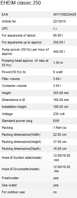 The EHEIM Classic 250 (2213) is a high-quality external canister filter that is perfect for aquariums up to 250 liters. It is a reliable and efficient filter that provides excellent water filtration for your fish.