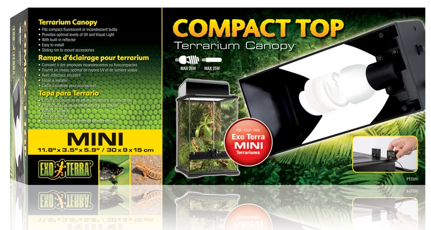The Exo Terra Compact Top Canopy is a compact fluorescent terrarium canopy designed for use with the Exo Terra Glass Terrarium.
