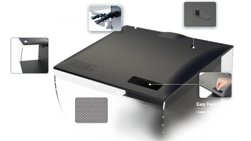 The canopy has a built-in cutout for feeding time, and just below the canopy is Fluval’s trademark honeycomb wrap, which helps conceal the waterline and rear compartment.