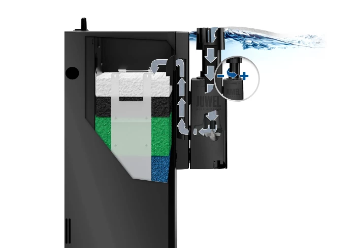 Impurities on the water surface are effectively removed and transported directly into the JUWEL inside filter.