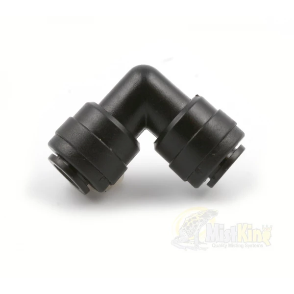 The Mist King 1/4″ Elbow Connector that can be used to easily place your misting system tubing around tight corners. This makes it ideal for applications where you need to evenly distribute water to misters or sprinklers.