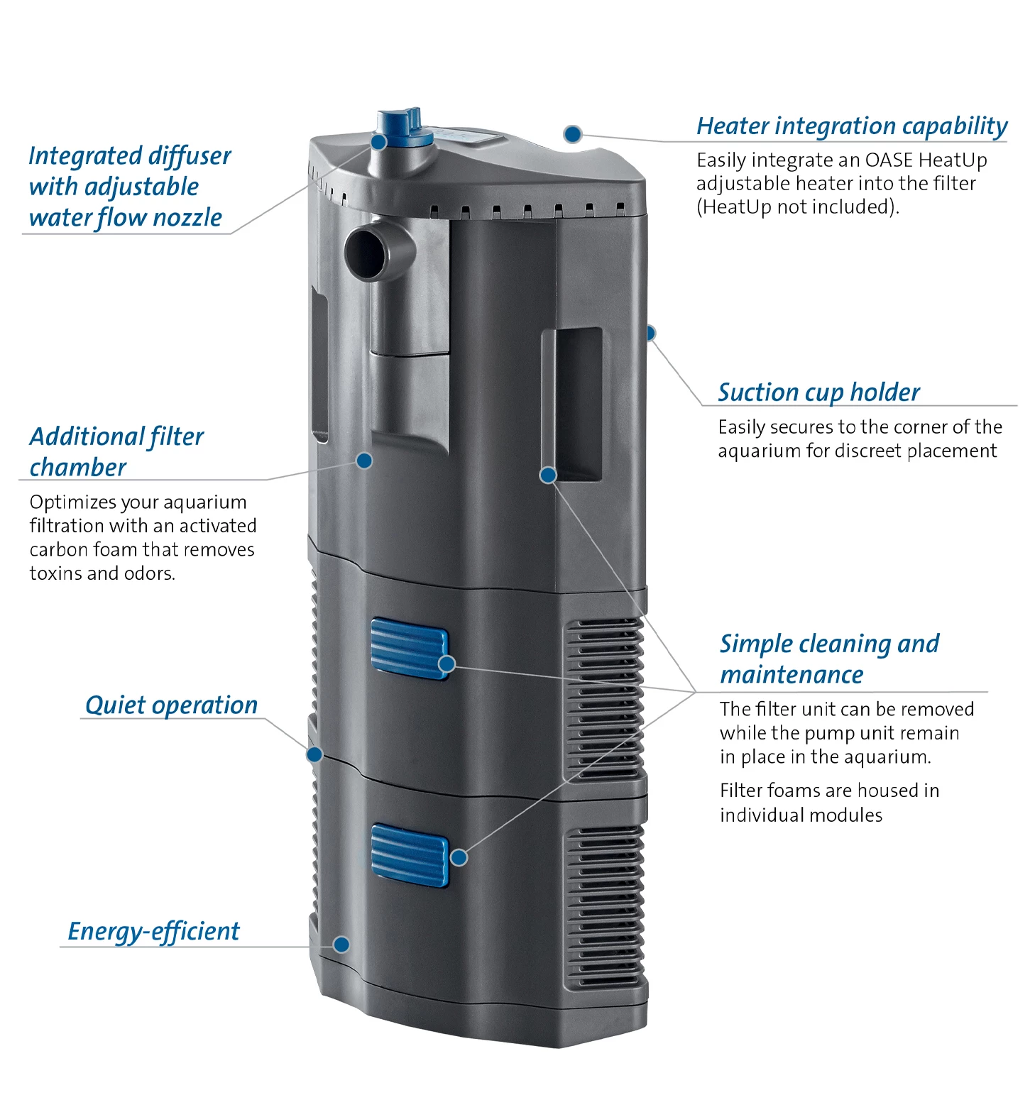 Easily integrate an OASE HeatUp adjustable heater into the BioPlus filter (HeatUp not included)