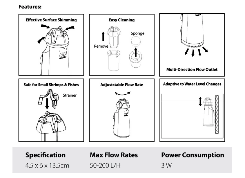 | 4.5x6x13.5cm | 50-200 l/ph | 3W |