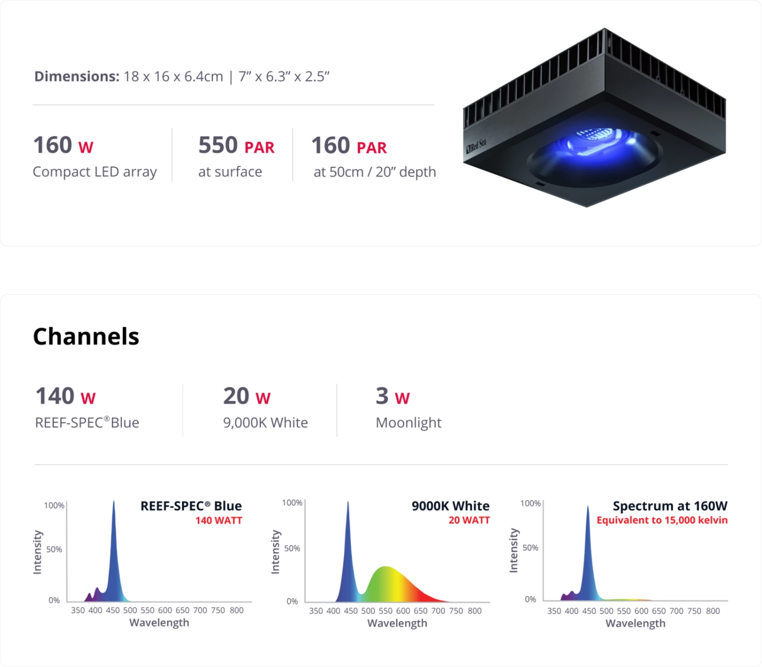 In addition, a separate dedicated 3W moonlight channel provides low levels of light for reef-safe night-time viewing.
