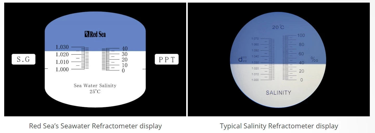 Therefore, Red Sea’s Seawater Refractometer calibrated at 25°C/77°F directly reads the absolute salinity of seawater with no need for temperature compensation factors