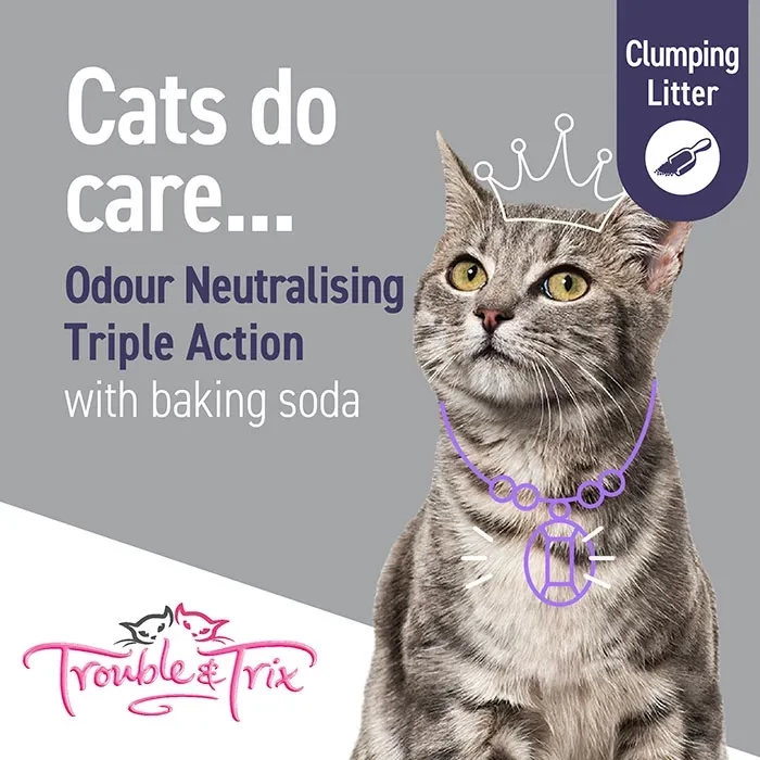 Trouble and Trix Clumping Odour Neutralising with Baking soda litter has a triple action formula with the added power of baking soda to rapidly trap pungent urine odours.