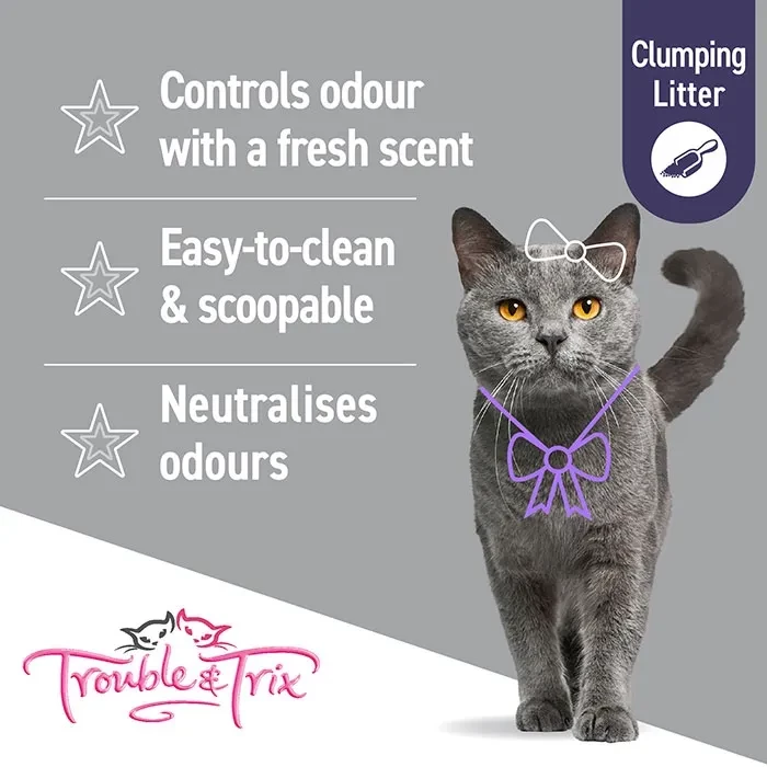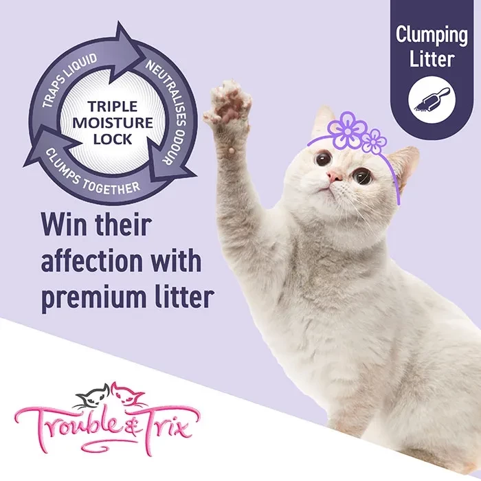 The Trouble & Trix cat litter range combines superior, long-lasting odour control, rapid absorption, and enhanced cleaning convenience via scoopable clumps or a fresher, lower maintenance home environment.