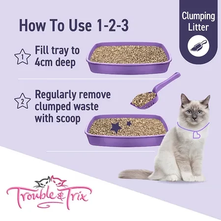 - Fill a clean, empty litter tray to a depth of 4cm (use liner if desired: See Trouble & Trix litter liners). Position tray in a convenient place for the cat.